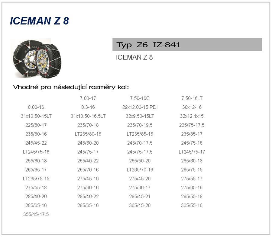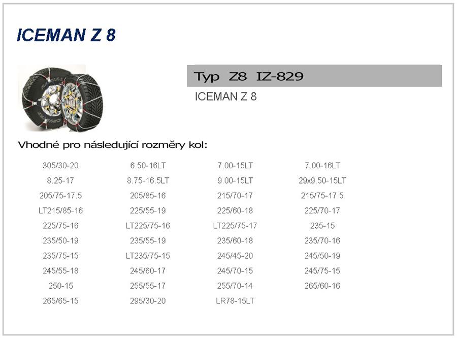 Iceman Z8 ™ je k dispozici pro dodávky, pick-upy a SUV 4x4. SCC navrhl Iceman Z8 ™, aby se vešly do těsných prostor bez jakýchkoliv negativních účinků na životnost, spolehlivost a trakci. Sněhové řetězy Iceman Z8 ™ mají následující výhody: