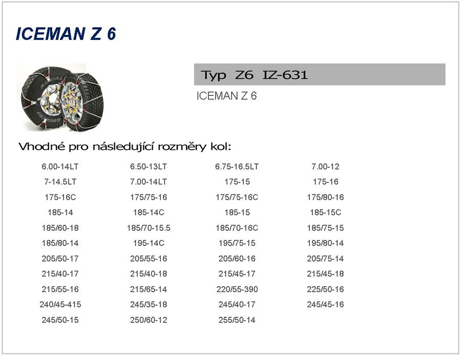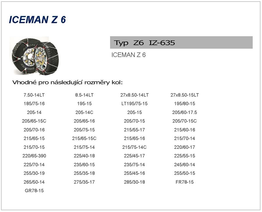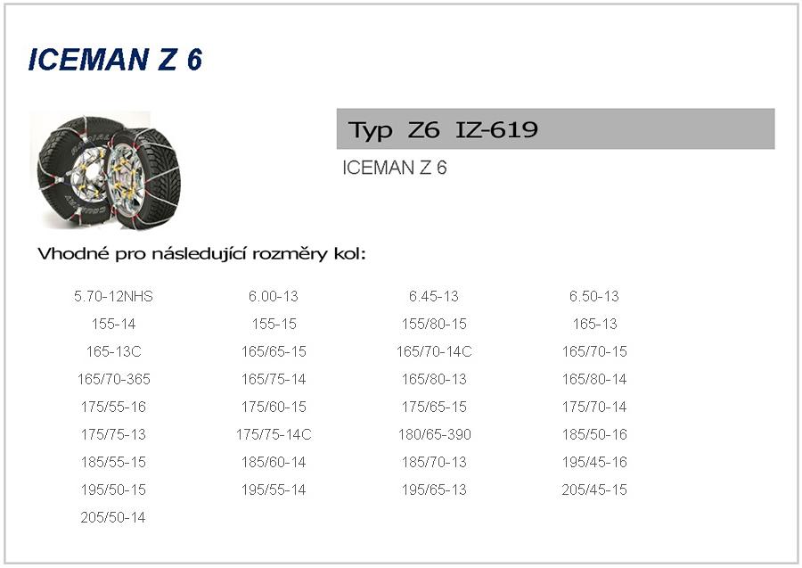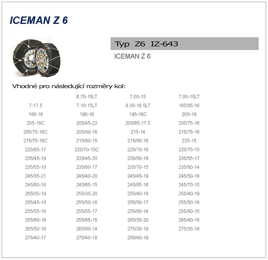 Iceman Z6 ™ je dispozici pro osobní automobily, pick-upy a SUV. SCC navrhl Iceman Z6 ™, aby se vešly do těsných prostor bez jakýchkoliv negativních účinků na životnost, spolehlivost a trakci. Sněhové řetězy Iceman Z6 ™ mají následující výhody: